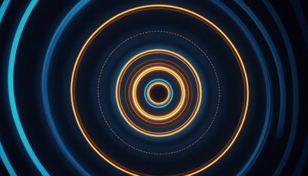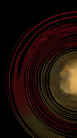 A minimal concentric circles with red and yellow lines on black background create dynamic abstract pattern with glowing center