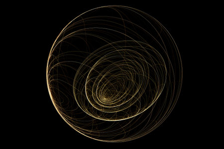 This image captures a mesmerizing pattern of golden light trails forming intricate, overlapping spirals against a dark background. The light trails create a sense of depth and movement, evoking a sense of cosmic beauty and dynamism. The spirals appear to emanate from a central point, gradually expanding outward in a symmetrical and harmonious manner.