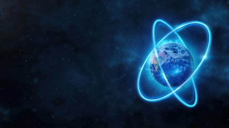 A stunning depiction of Earth illuminated by a bright blue orbit, set against a starry cosmic background, capturing the wonders of the universe.