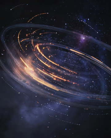 This artwork illustrates the dynamic movement of Earth's orbit in the cosmos, highlighting the intricate trails and bright patterns that represent celestial motion.