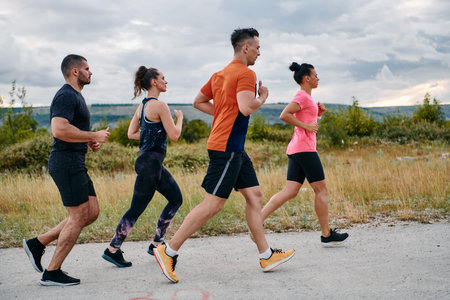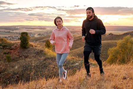 man and woman running at sunset or sunrise along field mountains, morning jogging of healthy lifestyle at dawn, cardio load increasing heart rate, time to dream, fitness training generation z