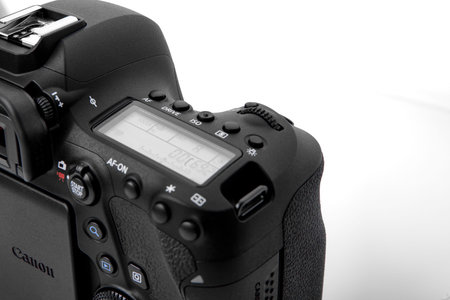 TOMSK, RUSSIA - March 17, 2020: Canon 70D camera on black background. Camera matrix is visible, with dedicated display