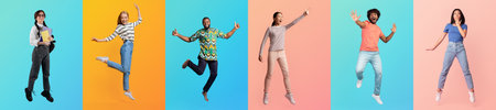 Diverse group of joyful individuals jumping in colorful backgrounds