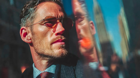 Confident businessman wearing sunglasses looks up at skyscrapers on a sunny urban day.