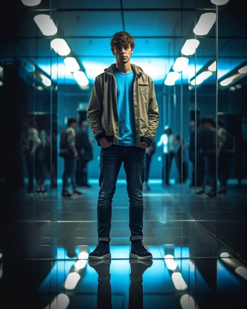 A man dressed in a dark sweater over a collared shirt stands inside a labyrinth of mirrors. His reflection is endlessly repeated, creating a disorienting and complex visual effect that suggests concepts of identity, confusion, and infinity.