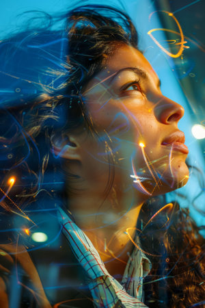 Artistic Portrait of a Pensive Young Woman with Light Bokeh Effects Through a Window at Night AI Generative