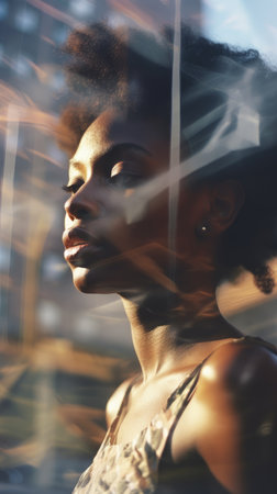 Casual street portrait of African American woman, double exposure and motion blur