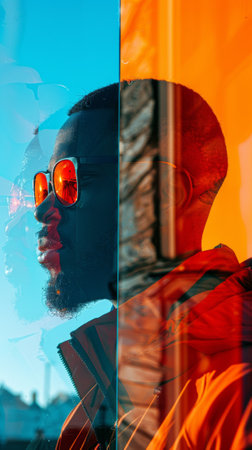 Man Immersed in Vibrant Neon Lights with Digital Reflections.