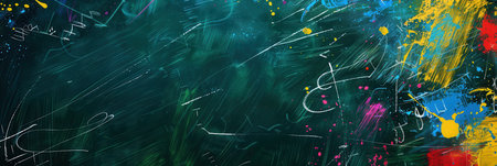 Vibrant brushstrokes in various colors decorate a dark green chalkboard in an art classroom during a creative session.