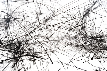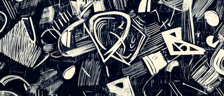Pencil strokes and brush marks intertwine across a blank canvas, forming a dynamic, textured design that captivates with its unforeseen movement and contrast.