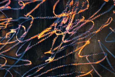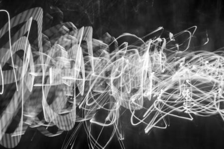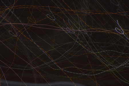 High-speed swirling light traces of city lights and car headlights on the road, highway in the night city, long exposure, abstract urban background.
