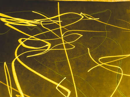 Bold, energetic scribble lines in black, blue, and gold tones create a dynamic abstract pattern against a clean white background.
