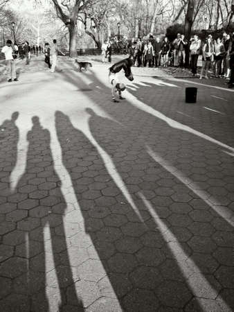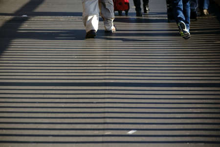 Light and shadows in New York City. Shadows of people walking street in morning light