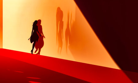 Silhouette of a person moving with arms in front of a patterned backdrop, warm lighting