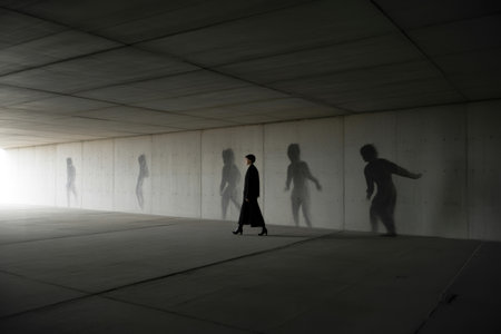 Minimalist human silhouettes walking against a glowing monochrome backdrop