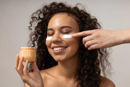 Beauty portrait of young african american woman applying cosmetic cream on face.