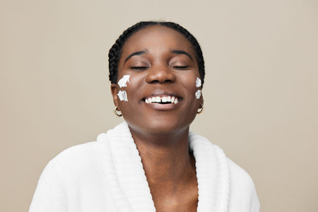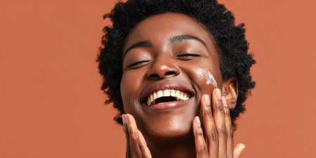 Happy Black woman applying skincare cream on her face, relaxed and joyful expression, against a neutral beige background, emphasize beauty and self care