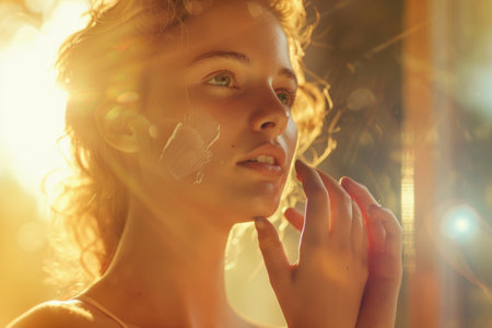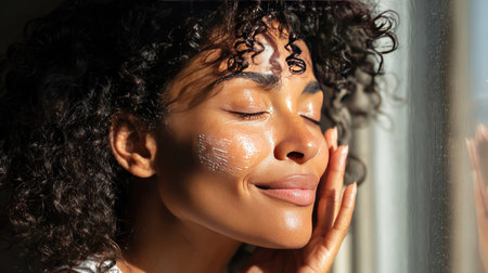 A serene woman applying skincare treatment in a sunlit room, enjoying a moment of self-care and relaxation. Embrace beauty and wellness in everyday routines.
