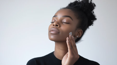 A stunning woman applies skincare cream with grace, eyes closed in a moment of relaxation. Her radiant complexion and poised elegance highlight the power of a nourishing skincare routine.