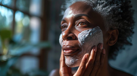 African American mature woman applying white cream mask on her face in bathroom