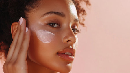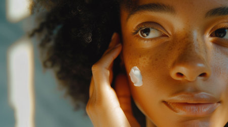 African American woman gently applying skincare cream, with soft lighting highlighting her smooth, radiant complexion