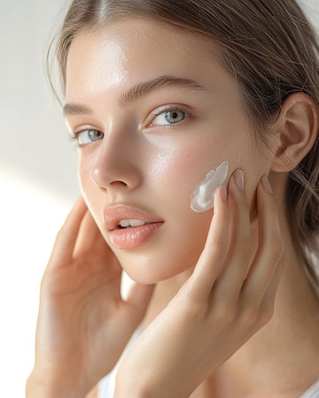Young woman preparing to start her day, applying moisturizer cream on face. Beautiful girl model with natural makeup.