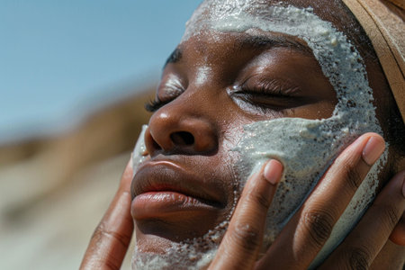 Closeup portrait of African American woman with cream mask applied on her face, beauty and skincare concept