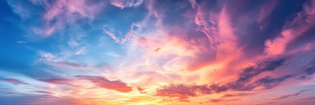 Dramatic panorama of the sunset sky with clouds in the evening.