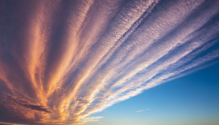A dramatic sunset sky filled with vibrant golden orange clouds against a deepening blue, stretching across the...