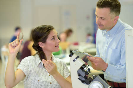Young hispanic teacher helping his student in chemistry class. Education, Tutoring and Encouragement concept.