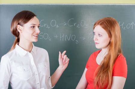 Beautiful teacher writing on the blackboard. Layout with space for text.