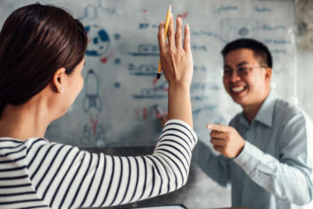 An Asian male teacher in a classroom near the whiteboard is writing and teaching a lesson with a special lecture in a class column. Math teacher explains arithmetic sums to university students.