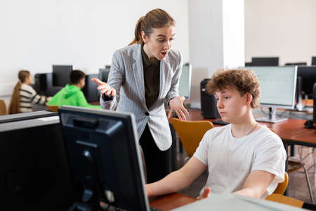 Young confident teacher bending over clever schoolboy sitting in front of laptop while checking individual assignment at lesson