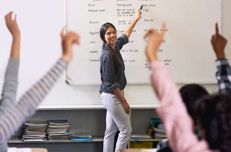 Educating tomorrows leaders. Shot of unidentifiable schoolchildren raising their hands to answer their teachers question in class.