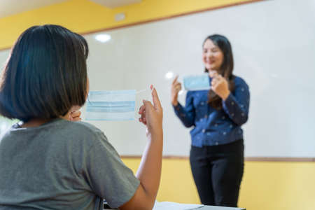 Asian teacher suggested the correct way to wear a mask to the students at elementary school in classroom after quarantine and lockdown.