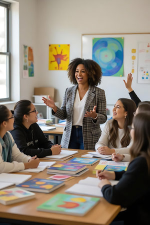 Back to School. Teacher enthusiastically interacting with students in a vibrant classroom.