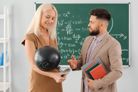Geography teacher showing globe to attentive students in classroom, using laptop and traditional tools for learning