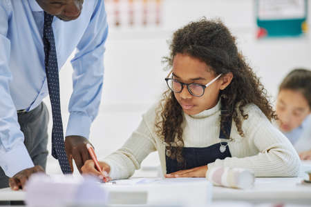 Portrait of young black schoolgirl taking test in school with teacher helping