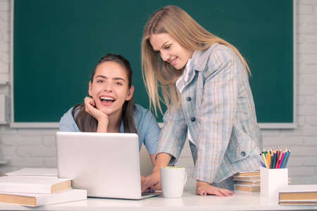 Students girls in classroom at college. Two students doing homework together and helping each other.