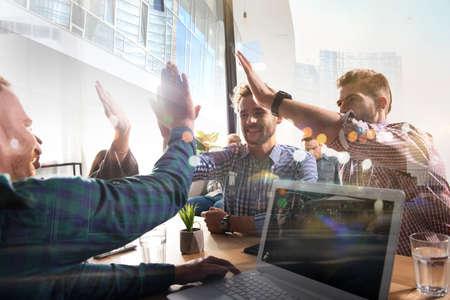 Colleagues celebrate the successful start of a business project in the office