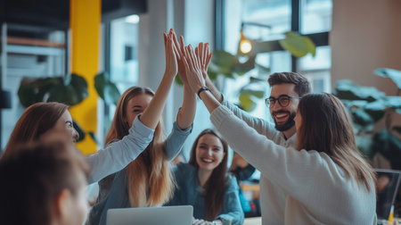 Dynamic group of coworkers giving high-fives in a cheerful celebration of business achievement within a contemporary office setting.