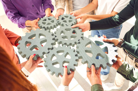 Strategy team solution teamwork partnership community alliance integration planning union concept. Groups of young people hold gear hands.
