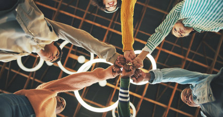 Team meeting are stacked hands in creative office.