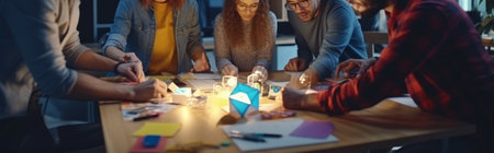 Enthusiastic teamwork is depicted as diverse hands unite over a detailed brainstorming sheet filled with colorful notes, illustrating a dynamic marketing project planning session.