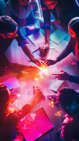 A diverse group of people are sitting around a large table that is adorned with an assortment of colorful squares placed strategically on top of it