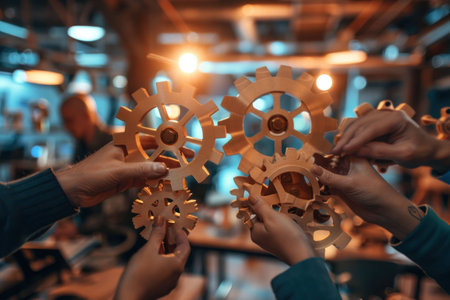 A captivating image depicting diverse hands collaboratively working on gears representing business strategies and management, symbolizing teamwork and growth.