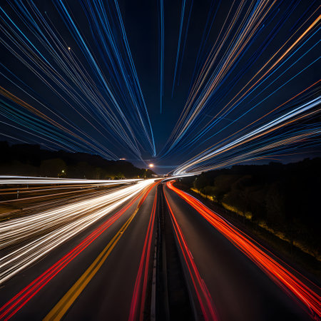 A vibrant cityscape at night, with streaks of colorful light trails from traffic creating abstract, flowing lines across the scene.