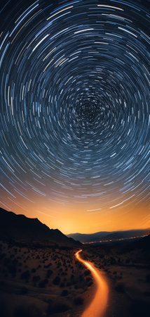 astrophotography with long exposure to capture star trails over a captivating landscape
