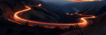 Aerial panoramic view of curvy mountain road with trailing lights at night. Winding road with car speed lights. Beautiful countryside landscape