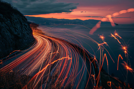 A long exposure shot captures the beauty of vehicles navigating the winding roads of the scenic byway creating an enchanting light trail display